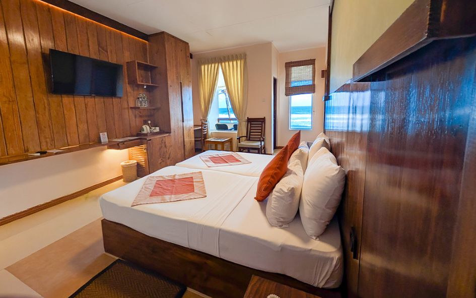 • Chambre double Deluxe 2 pers. (38 m² env.) : 1 lit king size ou 2 lits simples, climatisation, salle de douche avec WC. Balcon vue mer.