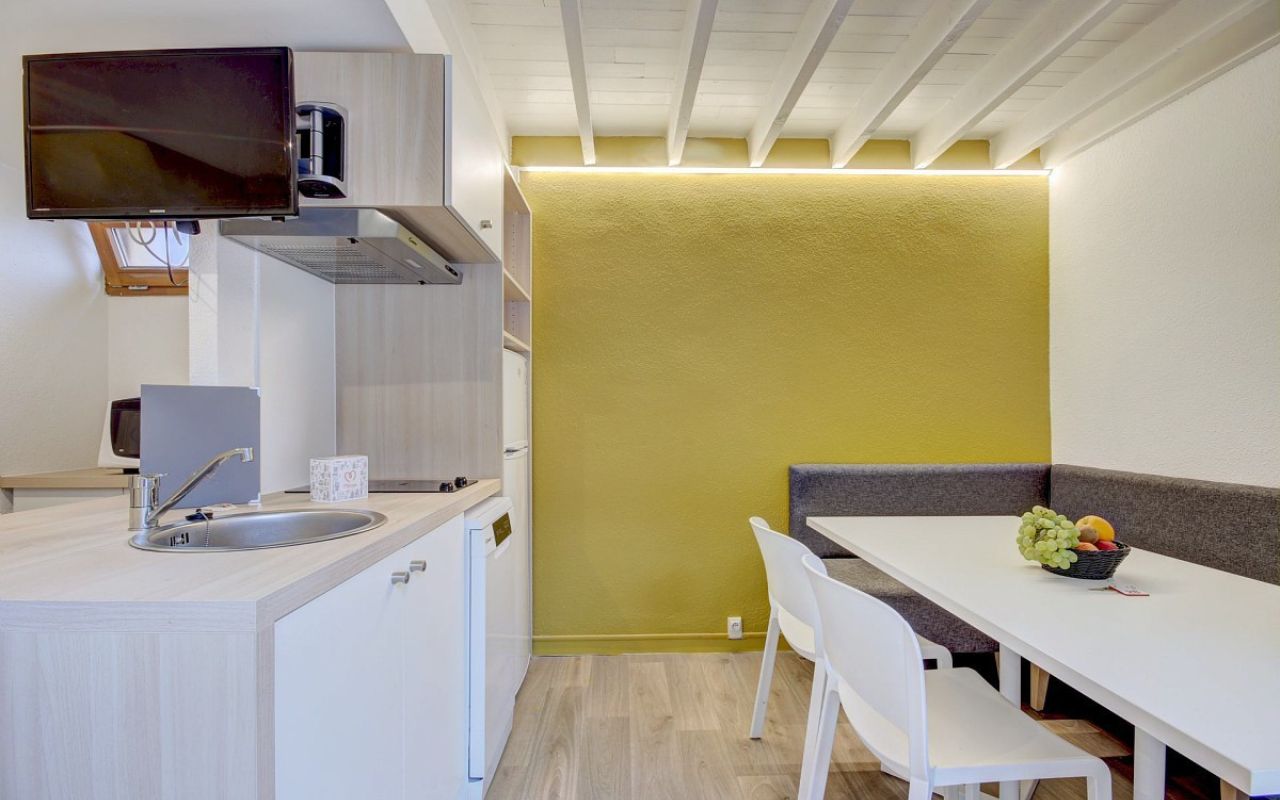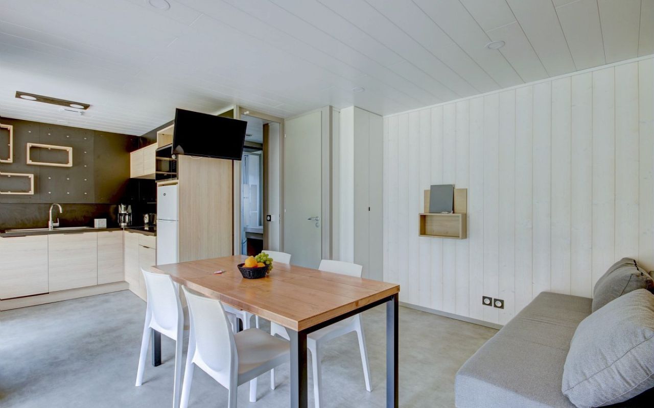• Villa 2 pers. (21 m² env) : en RDJ une chambre avec 2 lits simples et un coin cuisine-salon (séparation partielle entre les 2).