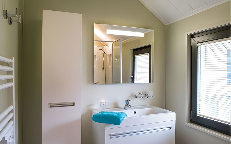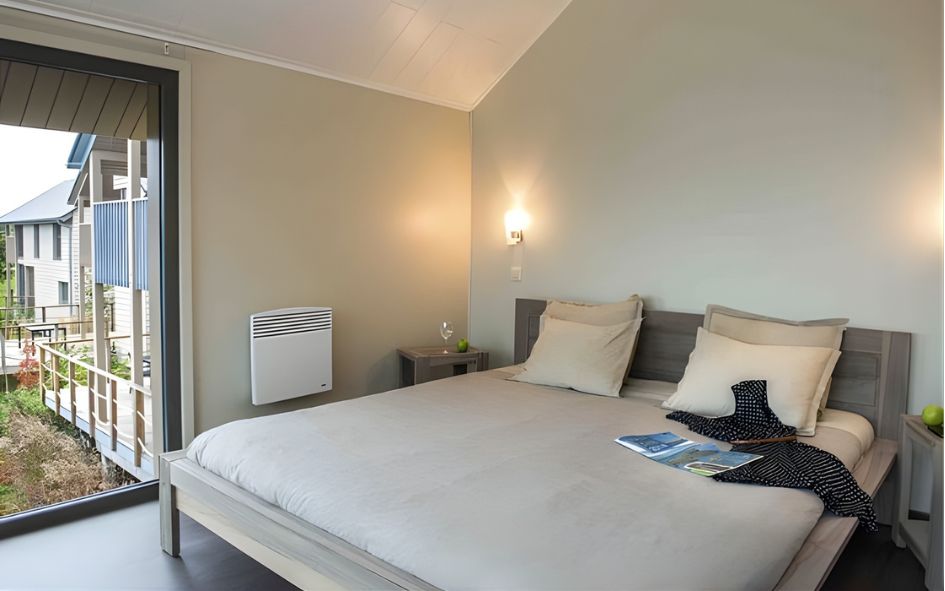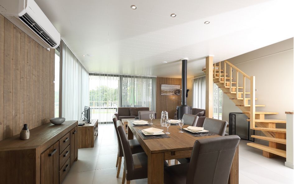 • Villa Prestige 6 pers. (115 m²) terrasse (30 m²) + balcon à l'étage : salle à manger avec foyer à bois, coin salon, 1 chambre avec 1 lit double avec petit balcon, 1 chambre avec 2 lits simples, 1 chambre avec 2 lits superposés*, SDB supplémentaire.