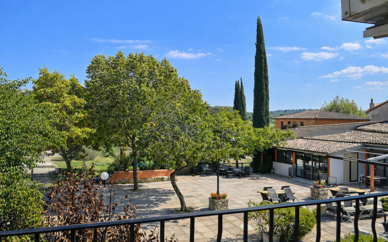 Résid’appart en étage avec balcon et mobilier de jardin.