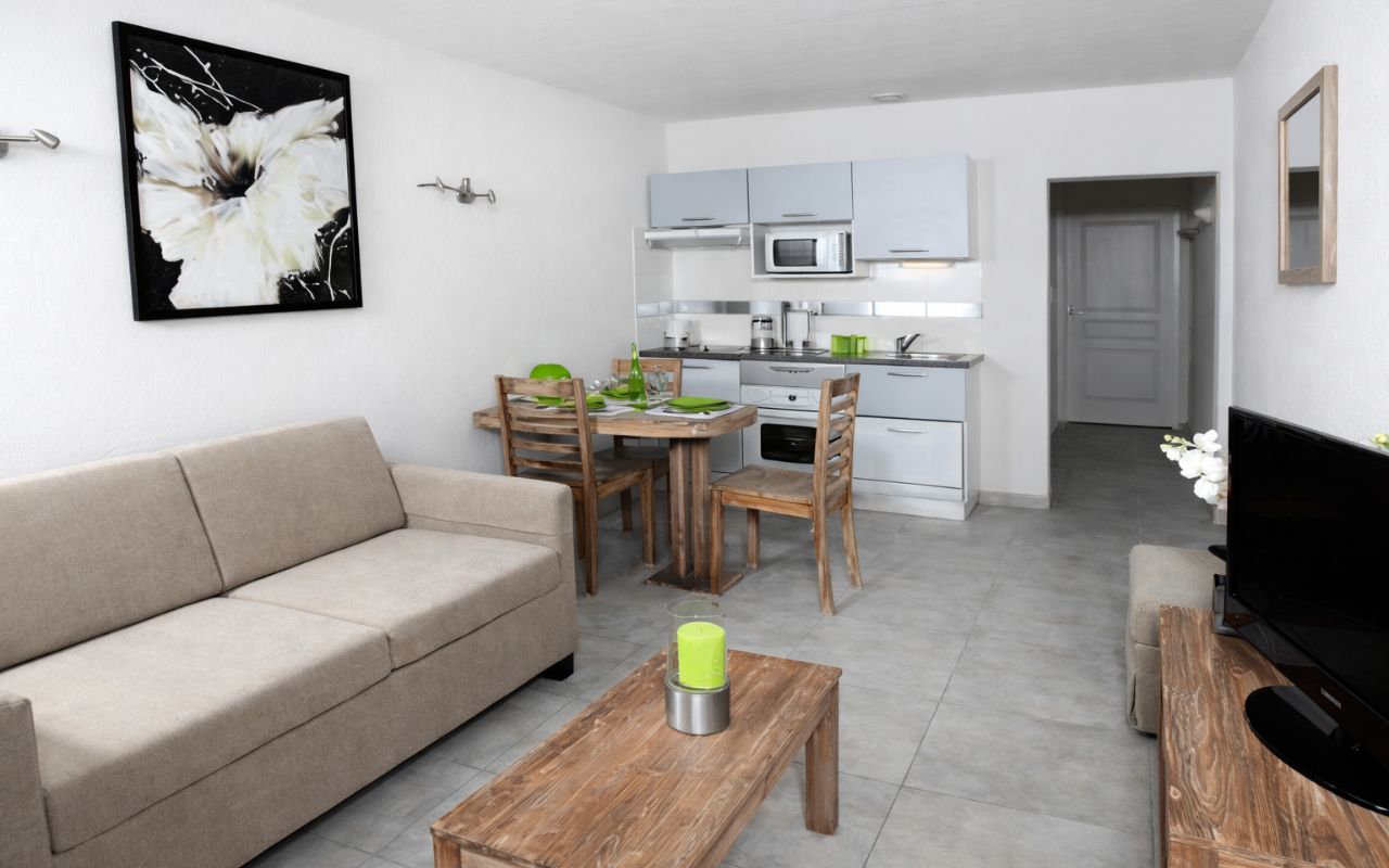 • Appartement 6 pers. (50 m² env.) : salon avec canapé-lit 2 pers., 1 chambre avec 1 lit 2 pers., 1 chambre avec 2 lits 1 pers.