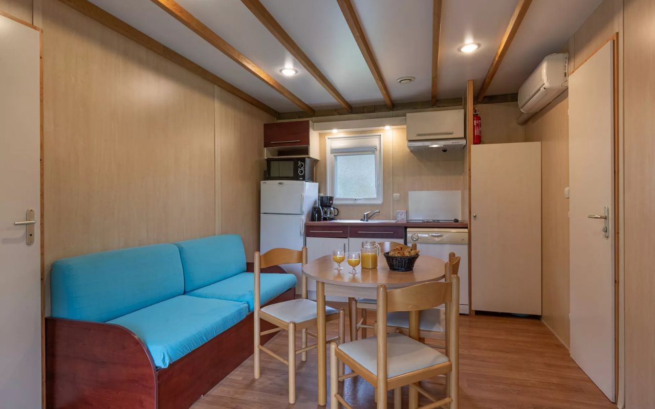 • Chalet quadruple (18 à 20 m²) : 1 lit double ou 2 lits simples, espace enfant avec 2 lits simples ou 2 lits superposés*, SDD/WC.