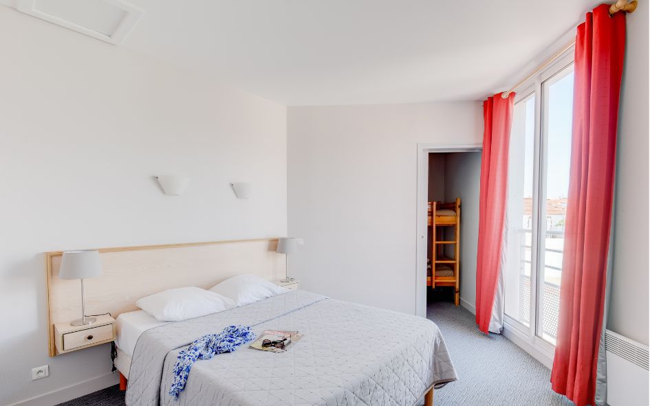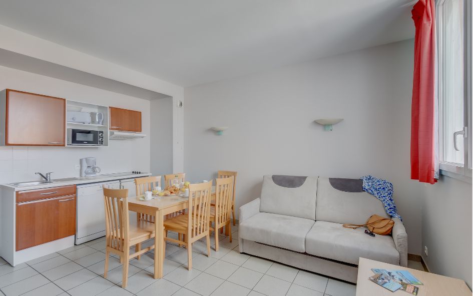 • 2P 2/4 pers. (25 m² env.) vue village : séjour avec canapé-lit 2 places, TV. 1 chambre avec 1 lit double ou 2 lits simples. Certains disposent d’une terrasse.