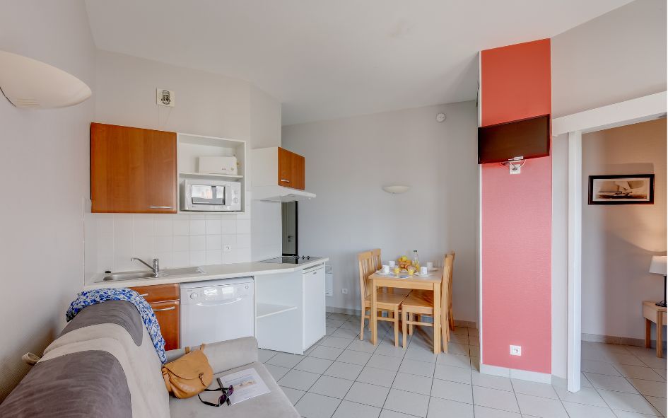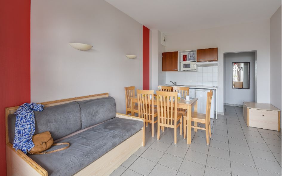 • 2P 5 pers. (39 m² env.) vue village : séjour avec canapé-lit, 2 places, TV. 1 chambre avec 1 lit double et 1 lit simple. Certains disposent d’un balcon.