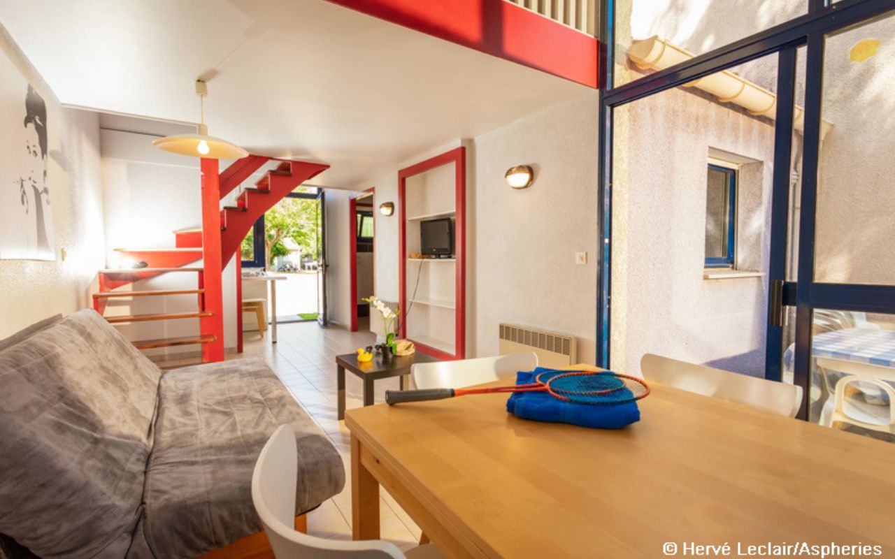 • Gîte 4/6 pers. (46 m²) : séjour avec canapé-lit, chambre avec lit double, mezzanine avec 2 lits simples.