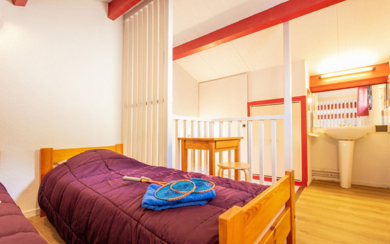 • Gîte 6/8 pers. (65 m²) : séjour avec canapé-lit, chambre avec lit double, chambre avec lits superposés*, mezzanine avec 2 lits simples.
