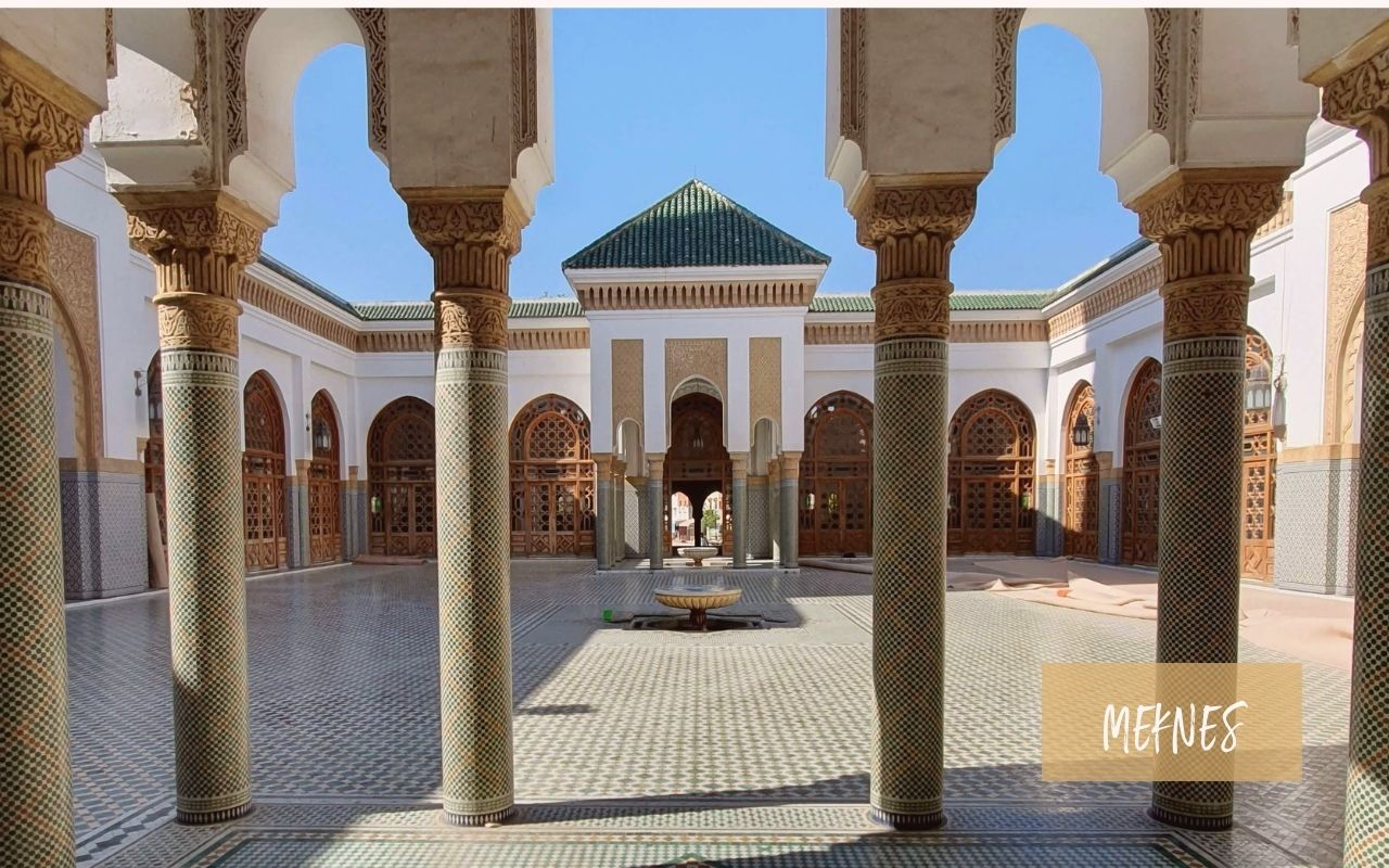 • Visite de Meknès sa porte monumentale décorée de zelliges et de céramiques vertes.