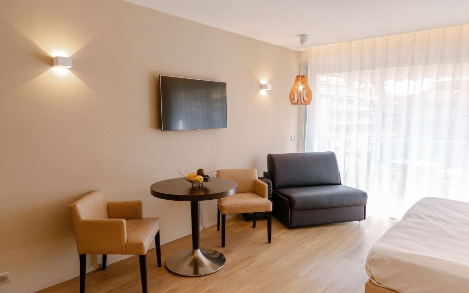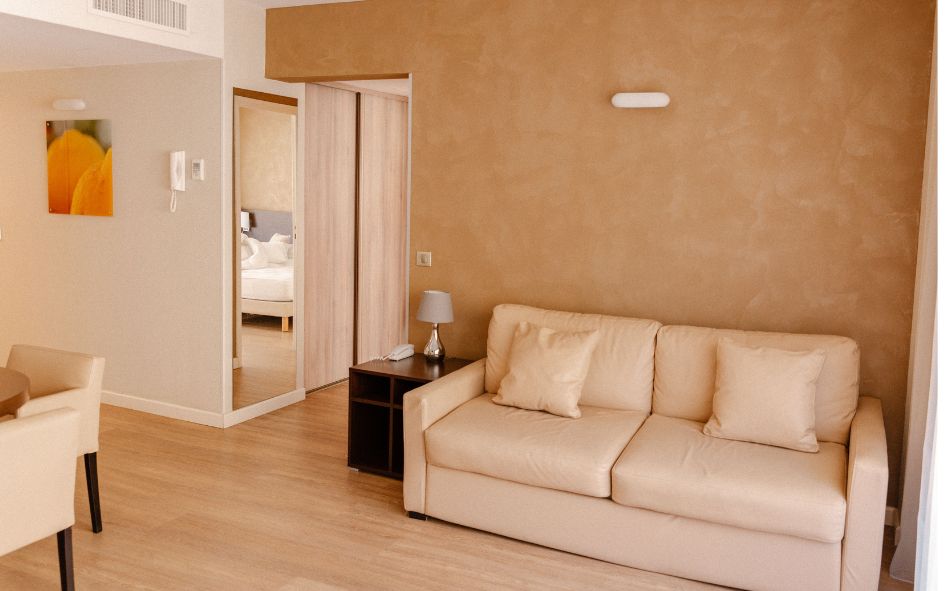 • Appartement 4/5 pers. (45 m² env.) : séjour avec canapé-lit 2 pers., chambre avec 1 lit double ou 2 lits jumeaux, canapé pour une 5ᵉ personne.