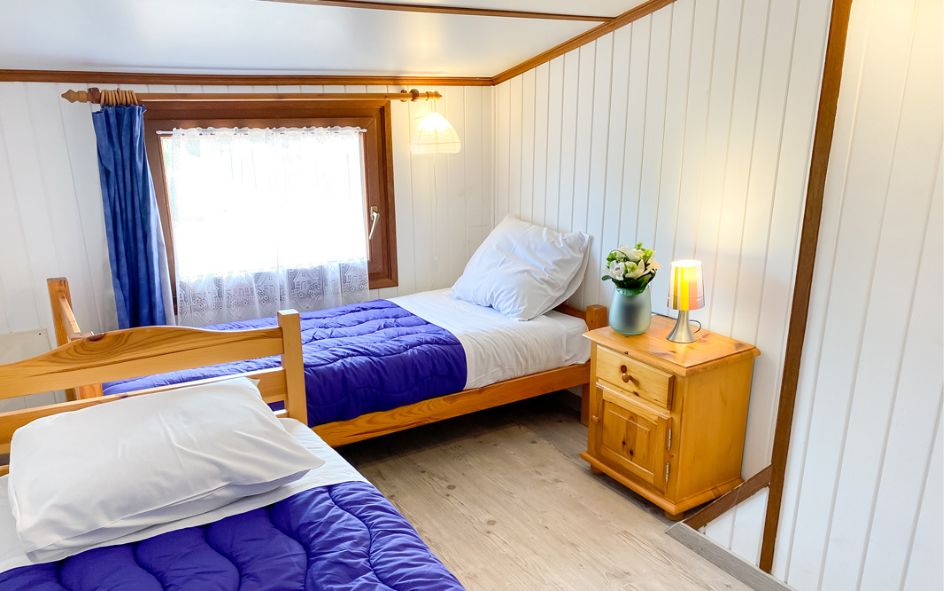 À l’étage : 1 chambre avec 1 lit 2 pers. (140x190), 1 chambre avec 2 lits 1 pers. ou superposés* (80x190).