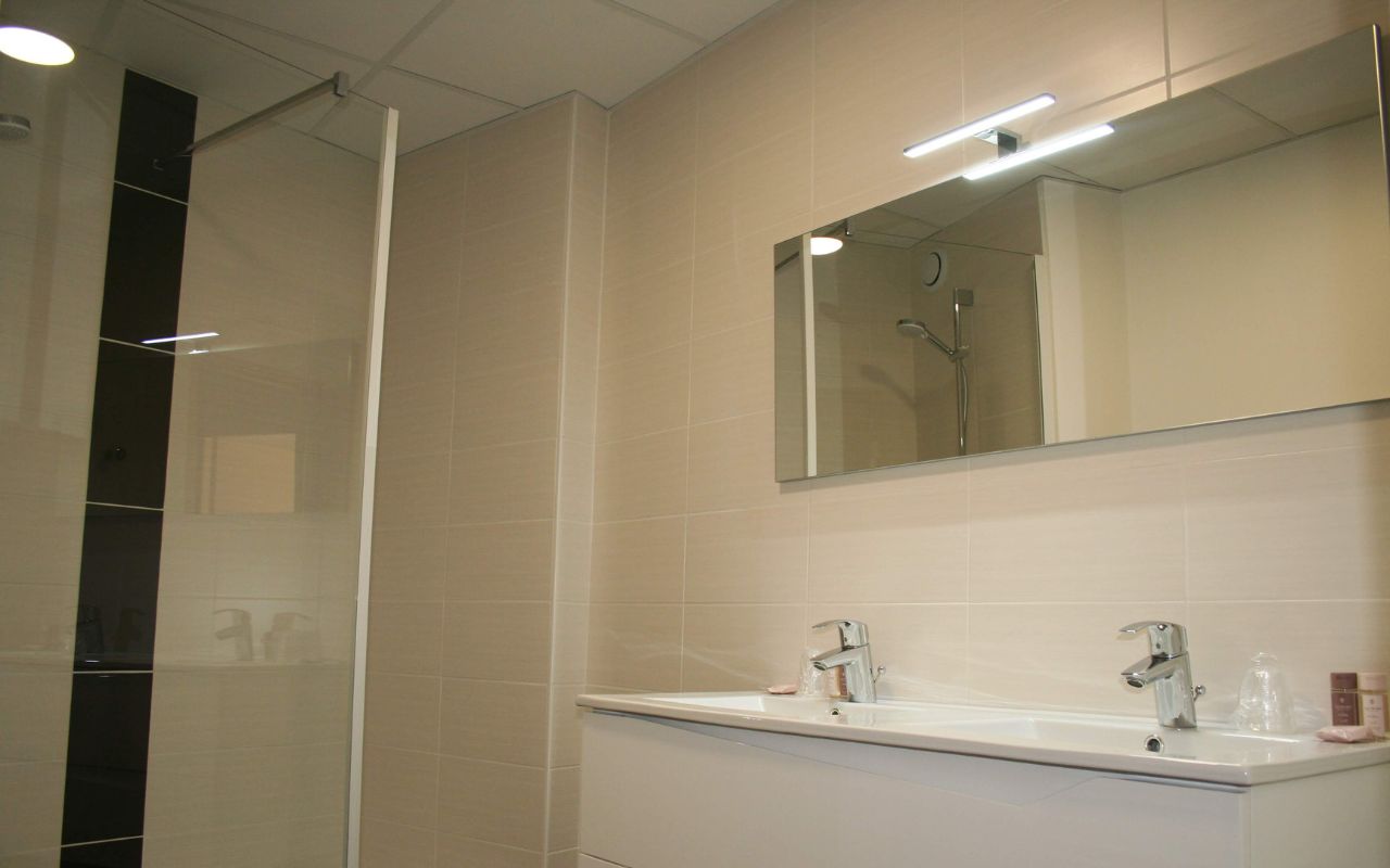 • Chambre familiale Prenium en duplex 4/5 pers. (45 m² env.) : RDC 1 lit double (160x200), à l'étage 2 ou 3 lits 1 pers. (90x200). TV dans chaque chambre.