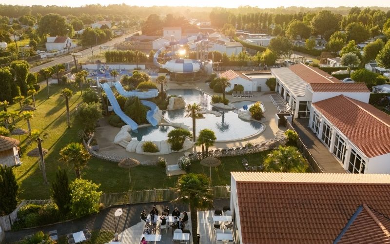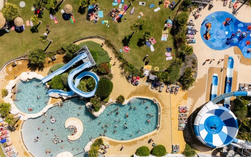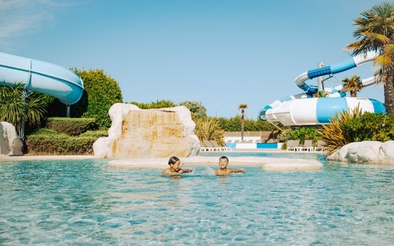• Parc aquatique de 1 500 m² avec piscines extérieures (chauffées à partir de mi-mai, ouvertes de mai à septembre), intérieures (chauffées et ouvertes de mai à septembre), espace aqualudique, 2 toboggans de 10 m de haut et 96 m de glisse (short de bain interdits)