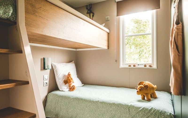 • Cottage Prestige 3 CH 6 pers. (36 m²) : 1 chambre avec 1 lit double (160), 2 chambres avec 2 lits simples (80). 2 SDD/2 WC.