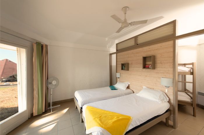 • Bungalow 3/4 pers. (27 m²) : 2 lits simples accolés (90x190) + 1 lit superposé* (80x190) séparé par une cloison en bois. 1 SDD et WC séparés.