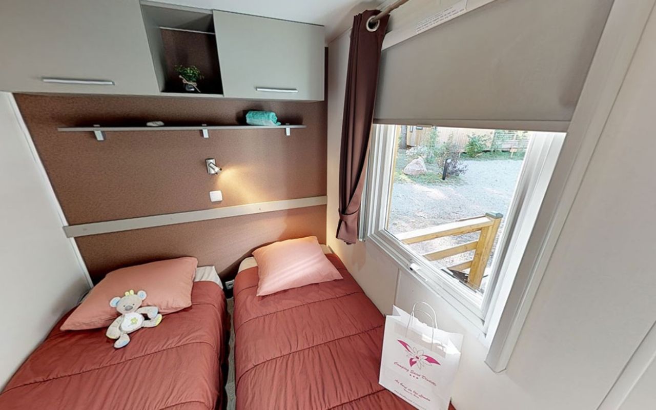 • MH Alpage 3 CH 6 pers. (33 m² env.) : 1 chambre avec 1 lit double (140x190), 2 chambres avec 2 lits simples (80x190).