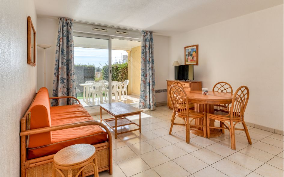 • 2P 8 Pers. coin nuit et vue mer (60 m² env.) : App en duplex. 1 chambre avec un lit double. 2 coins nuits (dont 1 mezzanine) avec lit superposé et 2 lits simples. Vue mer