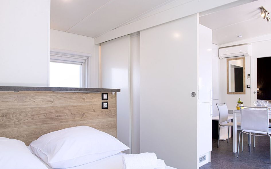 • Chalet Deluxe 2 ch. 4 pers. (34 m² env.) + terrasse bois (10 m² env.) : cuisine (lave-vaisselle, réfrigérateur avec congélateur, plaques de cuisson, Senseo, micro-ondes) ouverte sur la terrasse et la pièce à vivre (climatisée). Coin salon avec banquette en angle et coin repas, chambre avec 2 lits simples, chambre avec 1 lit (160/200), 2 SDB WC dans 1 des 2, WC séparés.