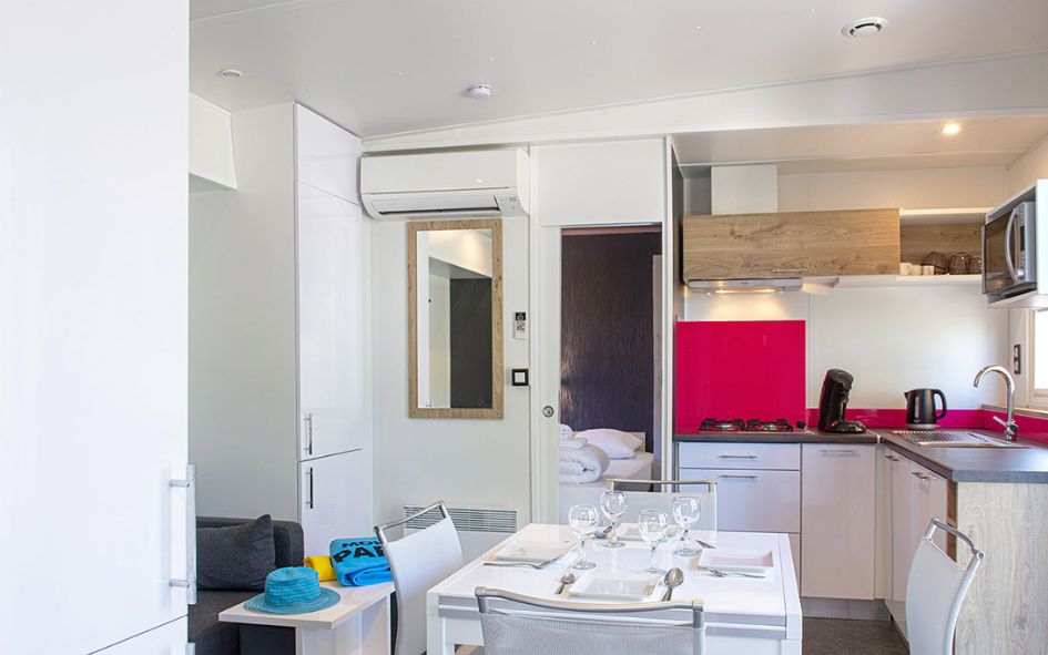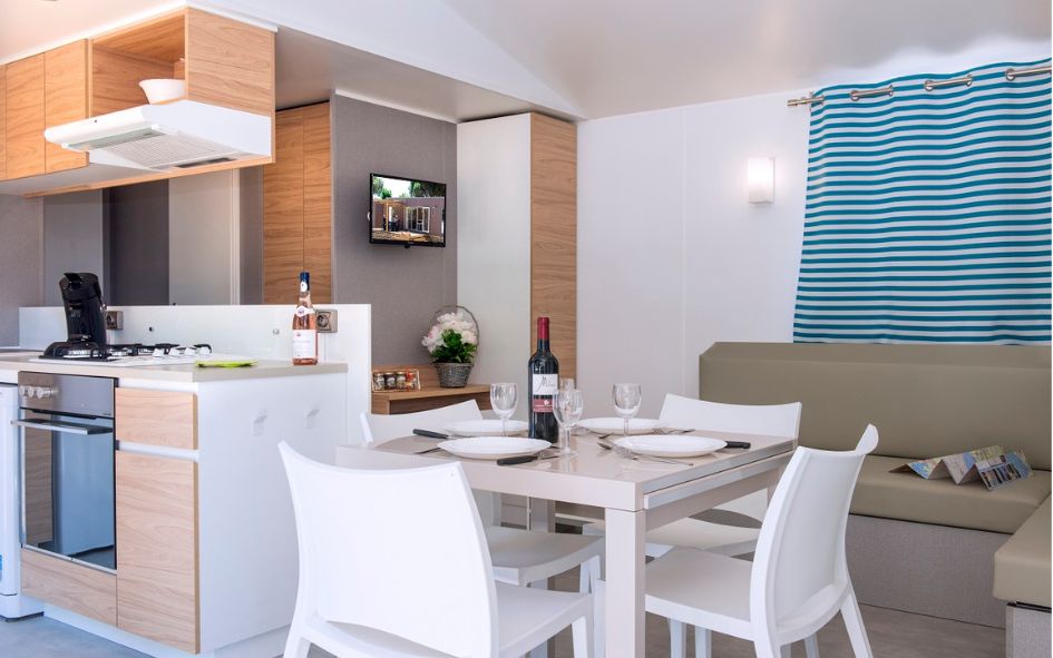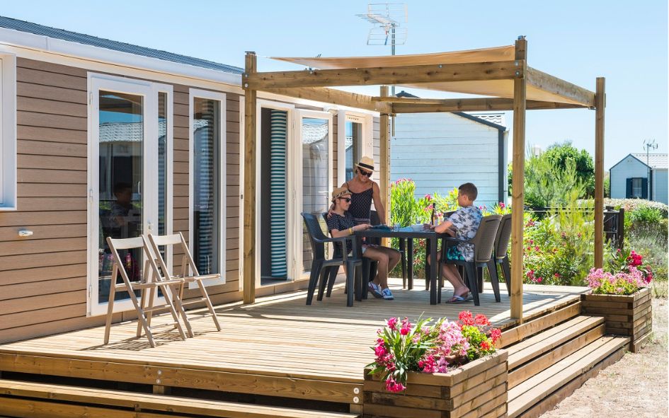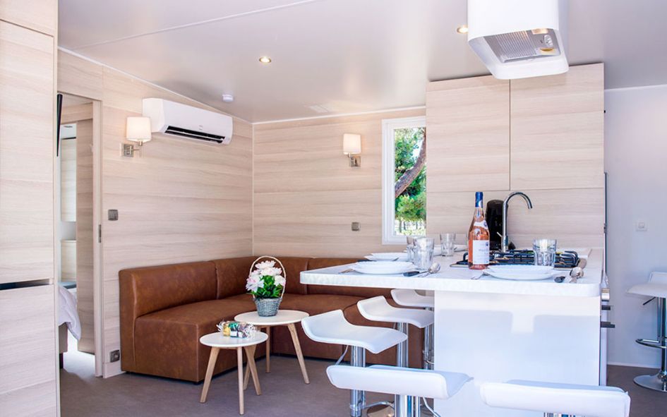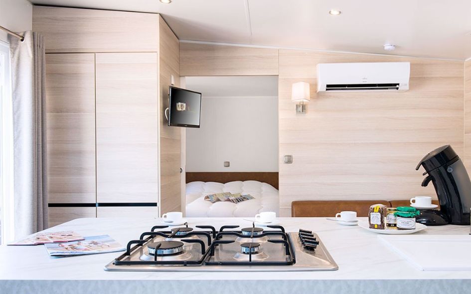 • MH classique Climatisé 6 pers. 2 ch. (42-48 m² env.) : coin cuisine (plaque au gaz, réfrigérateur, cafetière électrique, micro-ondes), séjour avec banquette transformable en couchage 2 pers., chambre avec 1 lit (140x190), chambre avec 2 lits 1 pers. (80x190), SDD, WC séparés, TV, grande terrasse en bois et meubles de jardin.